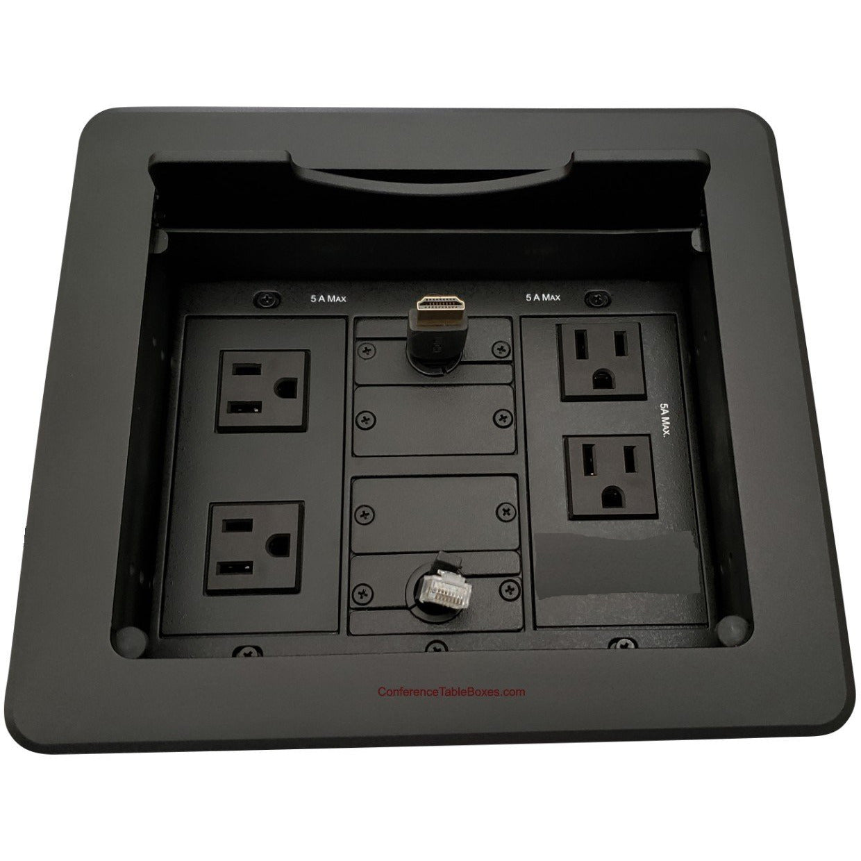 Table Well Box, 4 Power, Retractable HDMI & Cat6, Black